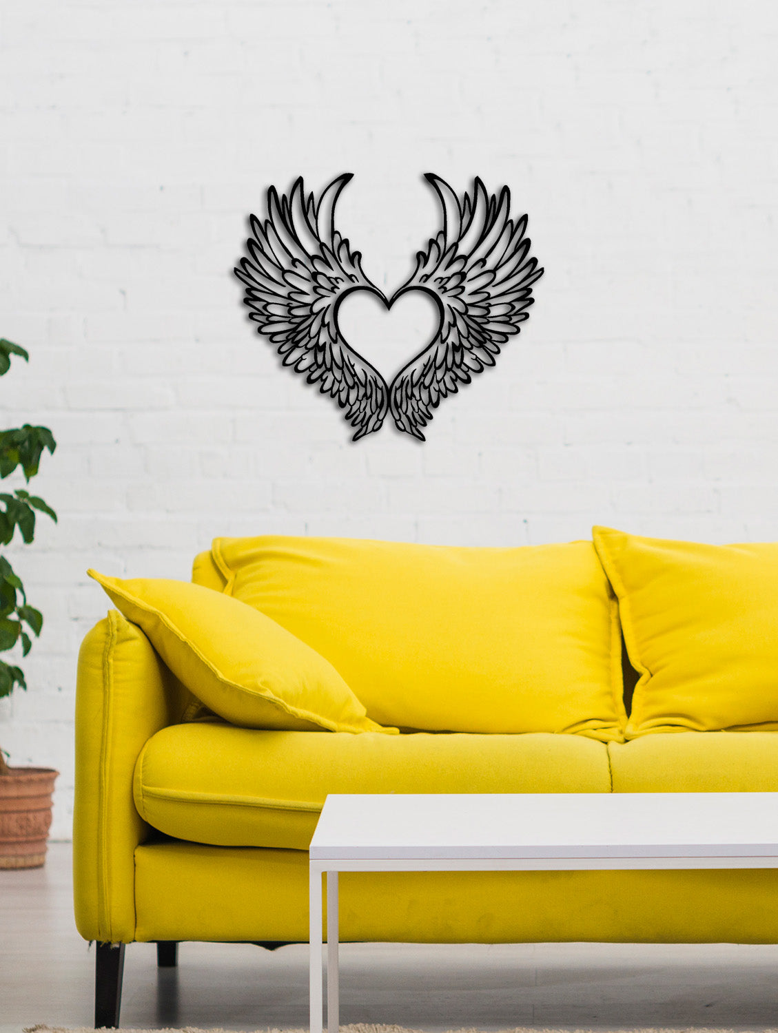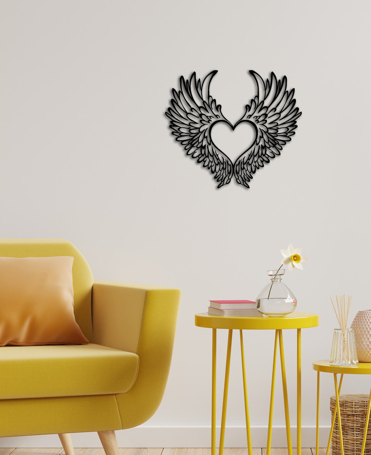 2 cm derinlik payı sayesinde, kanatların arkasında oluşan gölgeler duvarda gerçek bir 3 boyutlu derinlik hissi uyandırır. Bu 3D metal duvar sanatı, akşam saatlerinde gelen yumuşak bir ışıkla duvarınızda adeta kanat çırpan bir sevgi imgesi gibi canlanır.