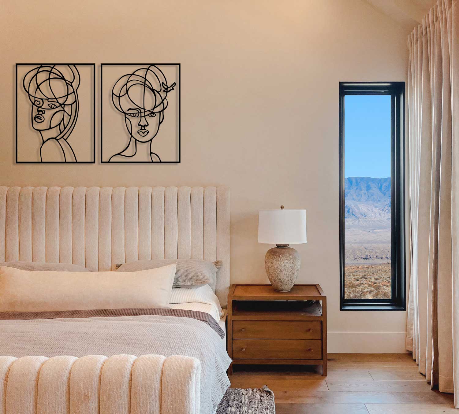Modern yatak odalarında yatak başı üzerinde veya minimalist salonlarda odak noktası olarak sergileyin. Siyah mat metalin asaletini, toprak tonları veya pastel duvar renkleriyle destekleyerek huzurlu bir atmosfer yaratın.