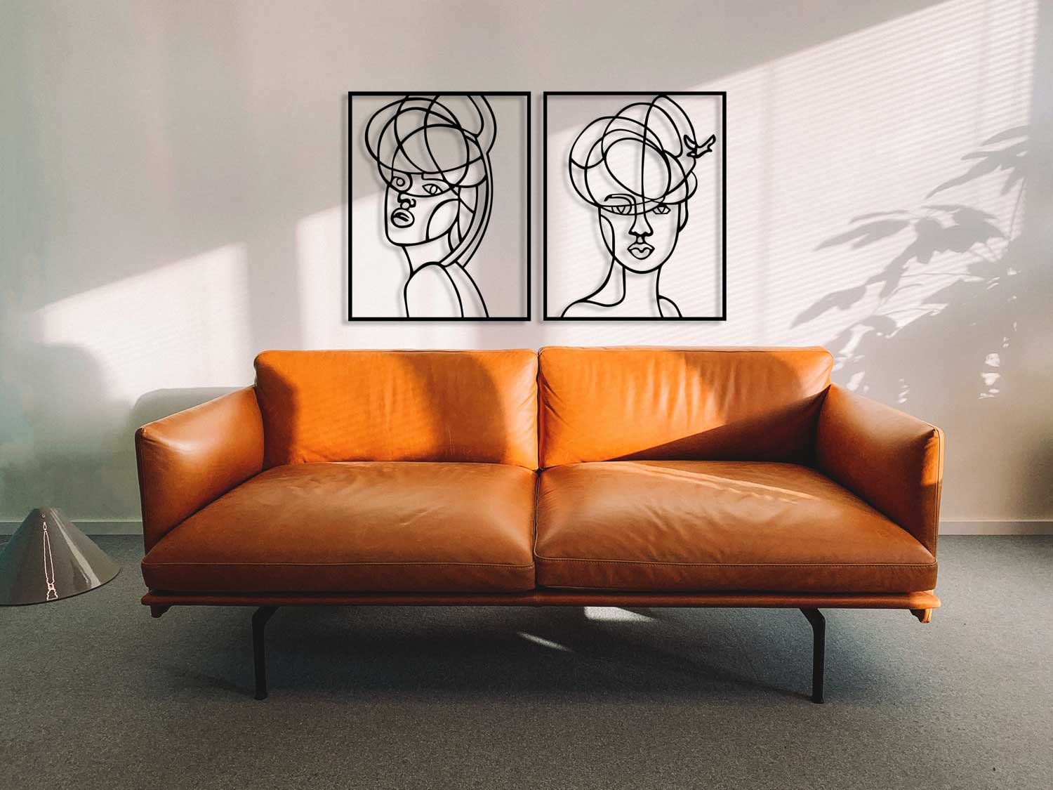Panelleri yan yana 10 cm boşlukla asarak simetriyi koruyabilir veya farklı yüksekliklere asarak soyut etkisini artırabilirsiniz. Duvardan 2 cm önde durma özelliği, her iki parçanın gölgelerini duvarda birbirine bağlar.