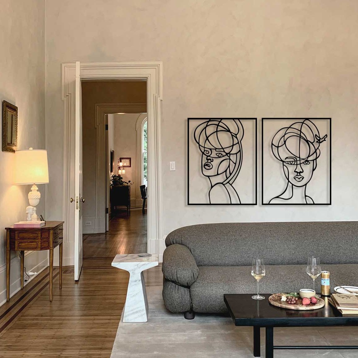 İki parça, sonsuz bir gizem... "Gizemli İkili", kadın silüetinin zarafetini soyut çizgilerle iki ayrı panele bölerek duvarınızda yaşayan bir kompozisyon oluşturur. Artroya’nın "Metal Sanatı ve Bilimi" disipliniyle hayat bulan bu set, mekanınıza sadece görsel bir şıklık değil, her ışık açısıyla yeniden şekillenen sanatsal bir derinlik katmak üzere mühürlenmiştir.