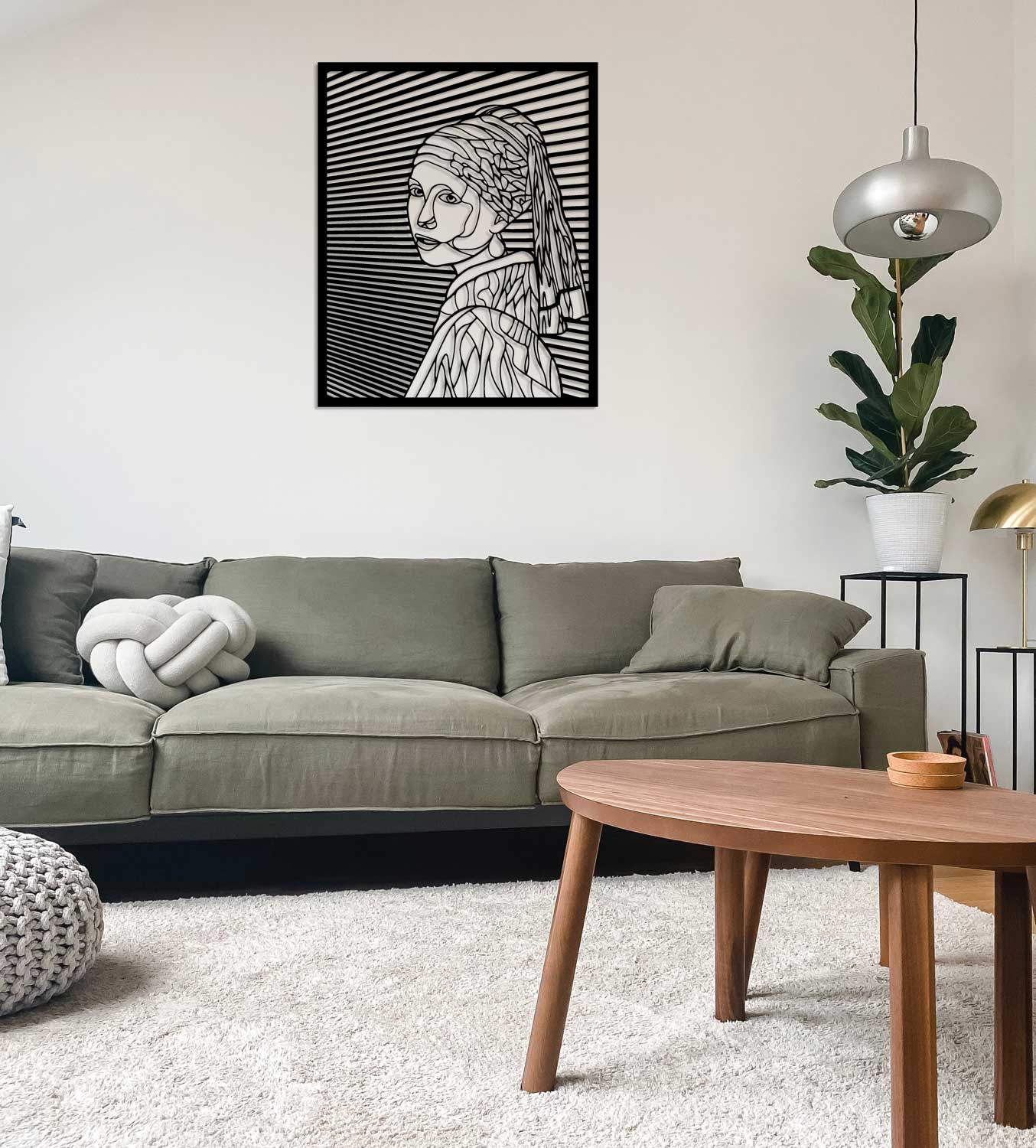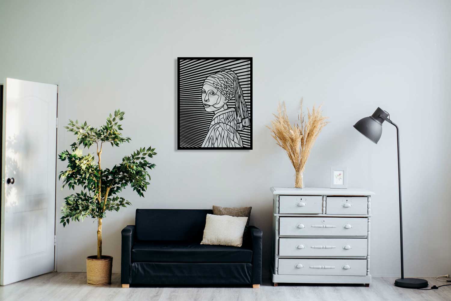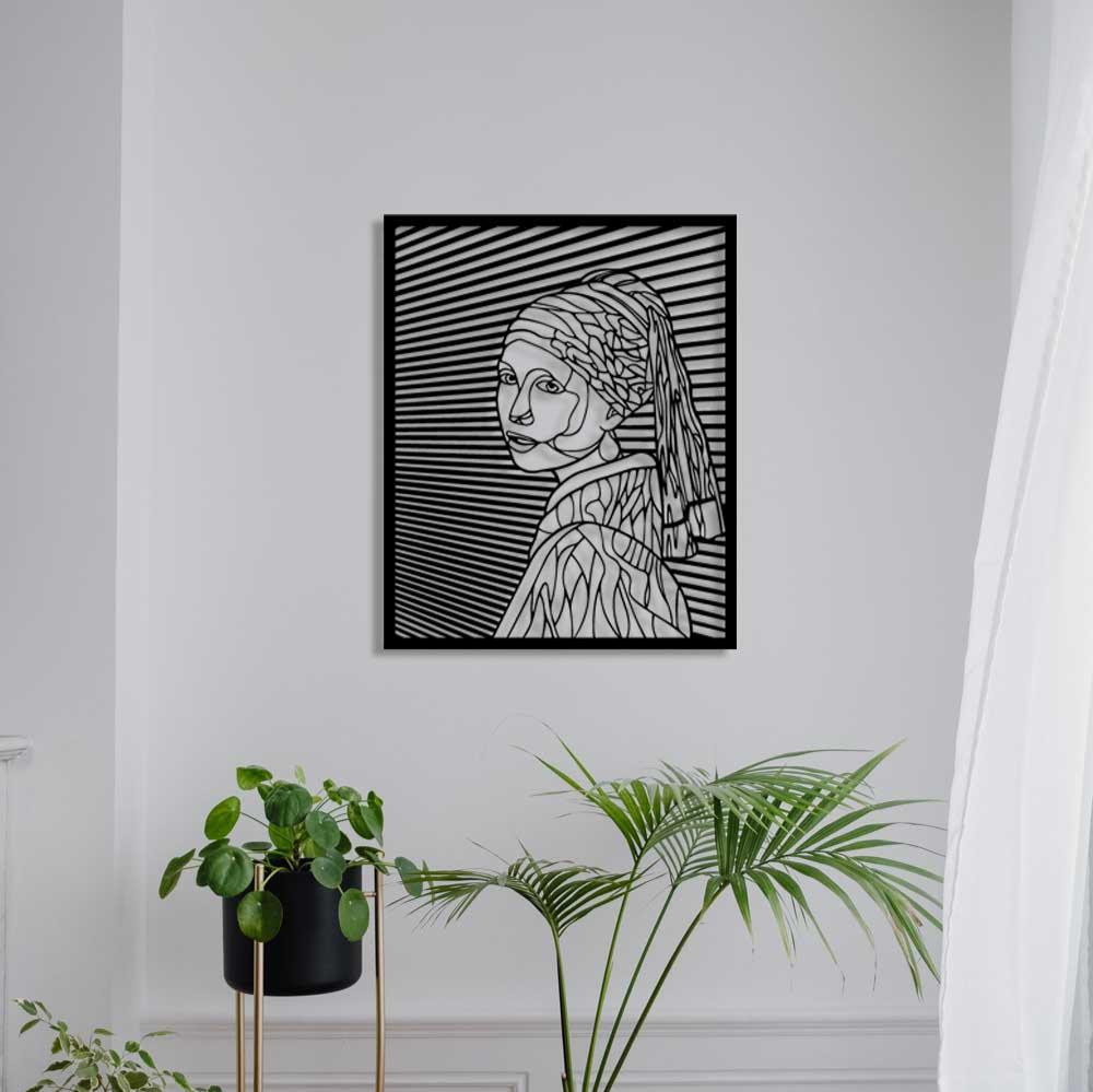 Vermeer'in ışığa olan tutkusunu onurlandırmak için tabloyu loş bir duvarın merkezine asın ve yan açıdan gelen bir spot ışığıyla destekleyin. Siyah metalin üzerindeki gölge oyunları, inci küpenin o meşhur parıltısını 3 boyutlu bir derinlikle yeniden canlandırır.