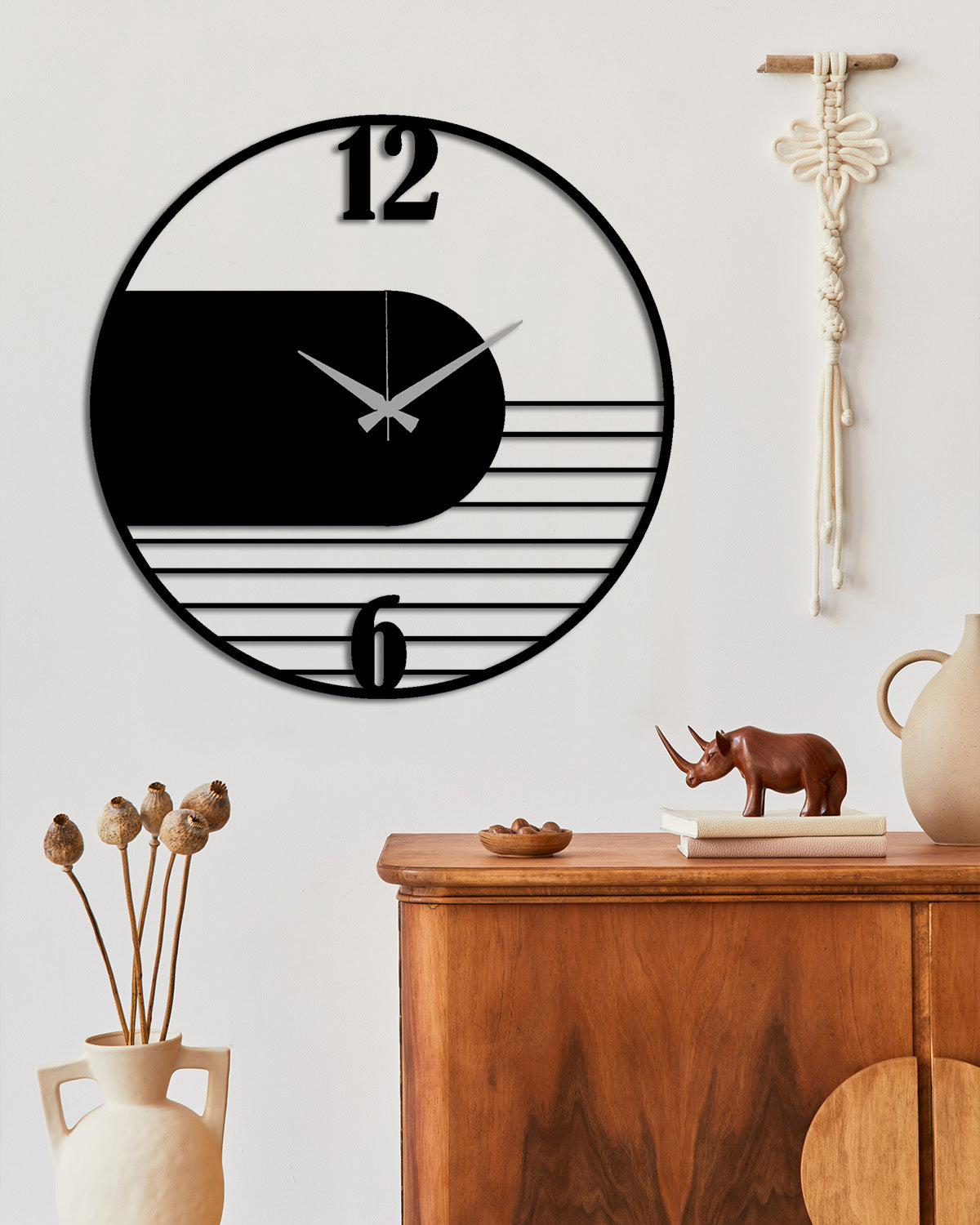 Modern Art saatinin dairesel ve minimalist yapısını vurgulamak için tabloyu salonunuzun ana duvarında, yemek masasının üzerinde veya ofisinizin girişinde sergileyin. Siyah metalin keskinliği, özellikle beyaz, gri veya antrasit tonlarındaki duvarlarda muazzam bir modern derinlik katar.