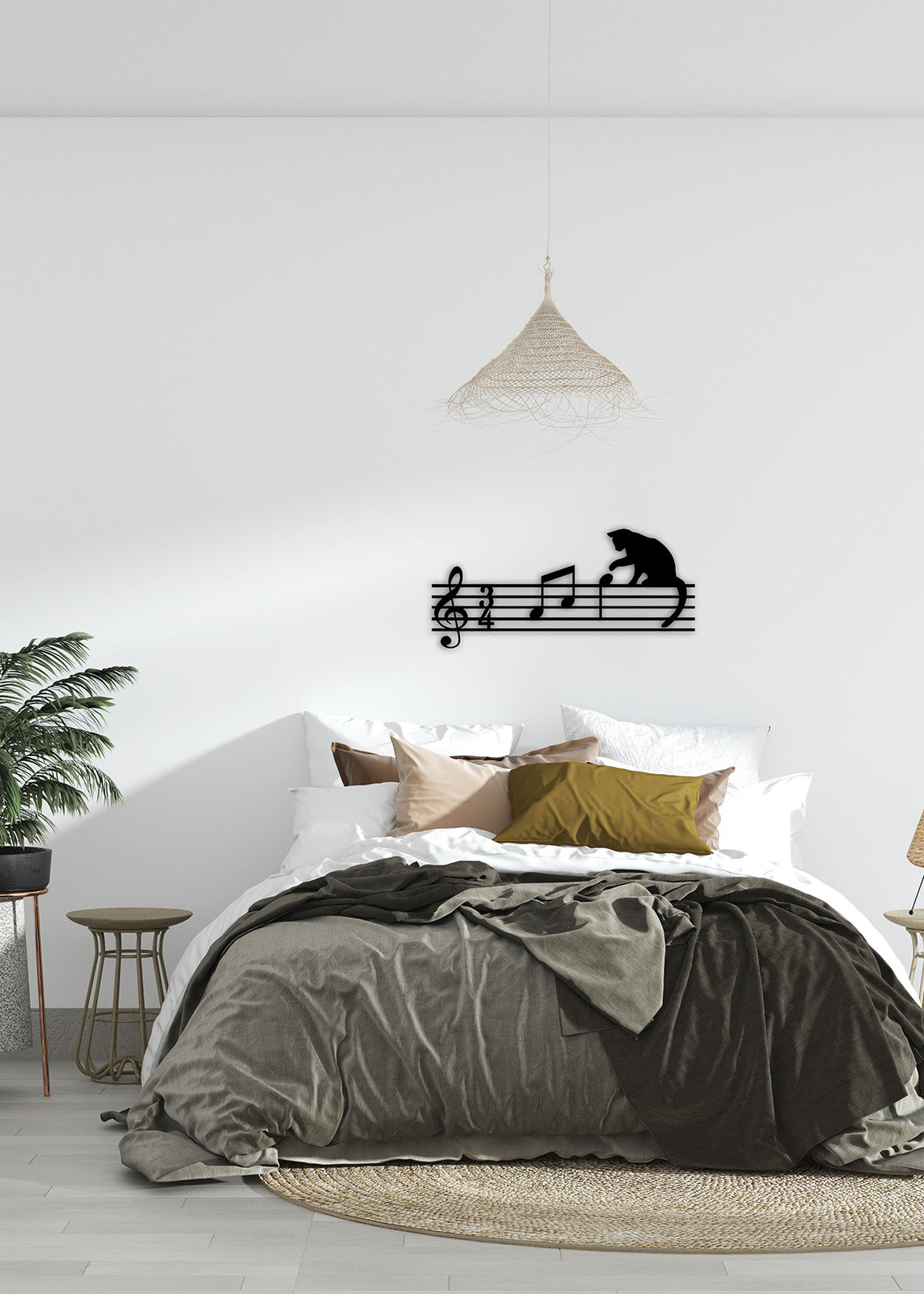 Notalarla oynayan kedi tasarımı; modern salonlar, genç odaları, piyano alanları veya hayvanseverlerin çalışma ofisleri için kusursuz bir aura düzenleyicidir. Tasarımın sunduğu yatay ve dinamik duruş, mekana anında "rafine, huzurlu ve sempatik" bir aura katar.